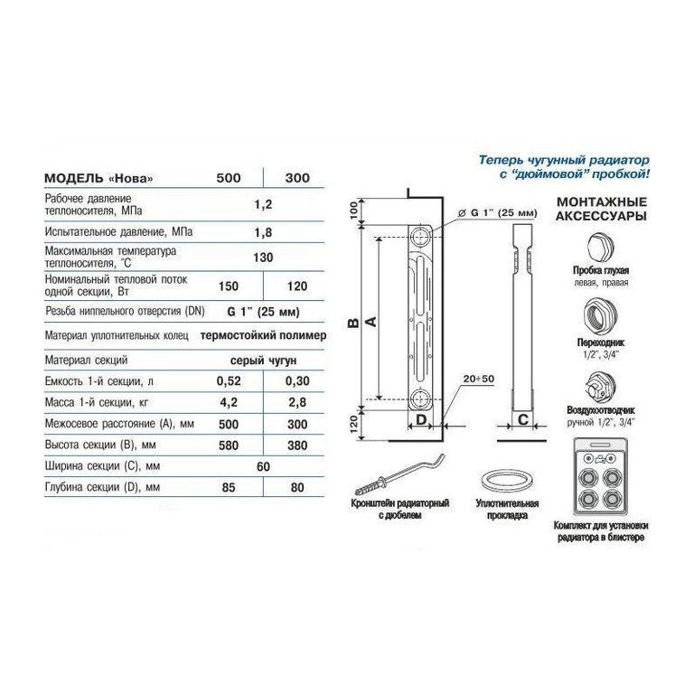 | Теплоотдача одной секции, Вт | 124 |