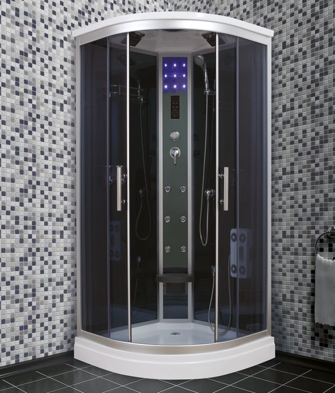 Размеры 1000х1000х2200, высота поддона 200 мм, верхний душ (тропический ливень), встроенный однорычажный смеситель TIMO с четырехрежимным переключателем на верхний душ (TROPICAL RAIN), сенсорный пульт нового поколения TsCP с функциями включения/выключения, FM-радио, верхний свет, вентиляция, безопасное напряжение на выходе 12 V.
