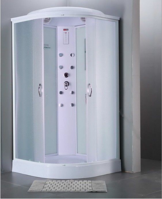 Размеры 1000x1000x2150, высота поддона 150 мм, матовые структурные стекла, верхний душ (тропический ливень), встроенный однорычажный смеситель TIMO с трехрежимным переключателем на верхний душ, душевую лейку, гидромассажные форсунки, хромированный смеситель, сенсорный пульт нового поколения с функциями включения/выключения, FM-радио, верхний свет, вентиляция, безопасное напряжение на выходе 12 V. Быстрая безсиликоновая сборка